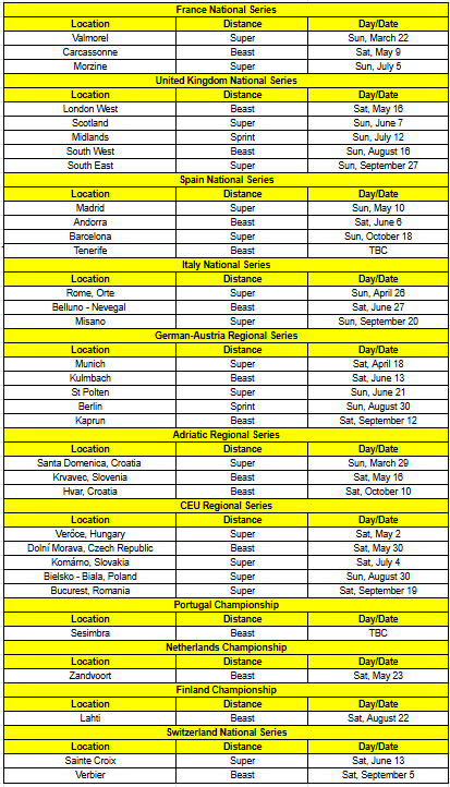 - One World Championship event per distance, includes Championships for 100M, Sprint, Super, Beast, Ultra, Trifecta, World’s Toughest Mudder and DEKA